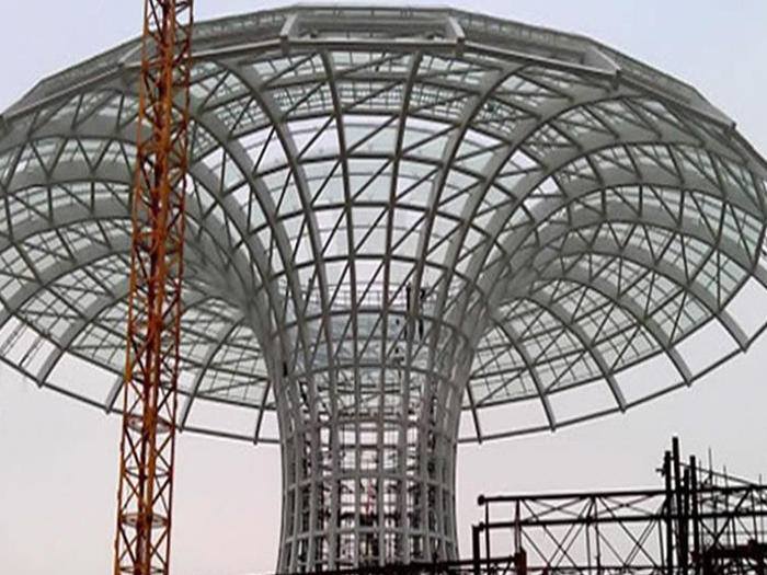 二、球形网架结构因其结构新颖,受力合理,自重轻、用钢量低等优点。如大型体育场馆球形长葛螺栓球网架、公共场馆球形网架、电厂长葛螺栓球网架、水泥工业球形网架、仓储物流球形网架、长葛干煤棚工业球形网架、长葛收费站长葛加油站球形网架、展览中心、影剧院、商场、航站楼、候车厅、工厂长葛车间、仓库、电视塔等球形螺栓球节点网架。国内球形网架结构主要分为:长葛焊接球节点网架及螺栓球节点网架两种。螺栓球节点网架其构件工厂内加工量较大,现场安装便捷,适用于现场工期紧,长葛施工条件、用电量受制约,网架形状复杂、长葛杆件定位困难的异形结构。螺栓球节点球形网架系统基本由长葛杆件、螺栓球、支撑支座等组成。按照节点形式可分为交叉长葛桁架体系、四角锥体系、三角锥体系等。支撑方式多为固定支座支撑。对于大面积、大跨度及有特殊受力或伸缩要求的网架结构可采用橡胶支座、滑移支座、球铰支座等支撑形式,以满足结构自身的受力稳定、均衡,便于内力释放等设计要求。